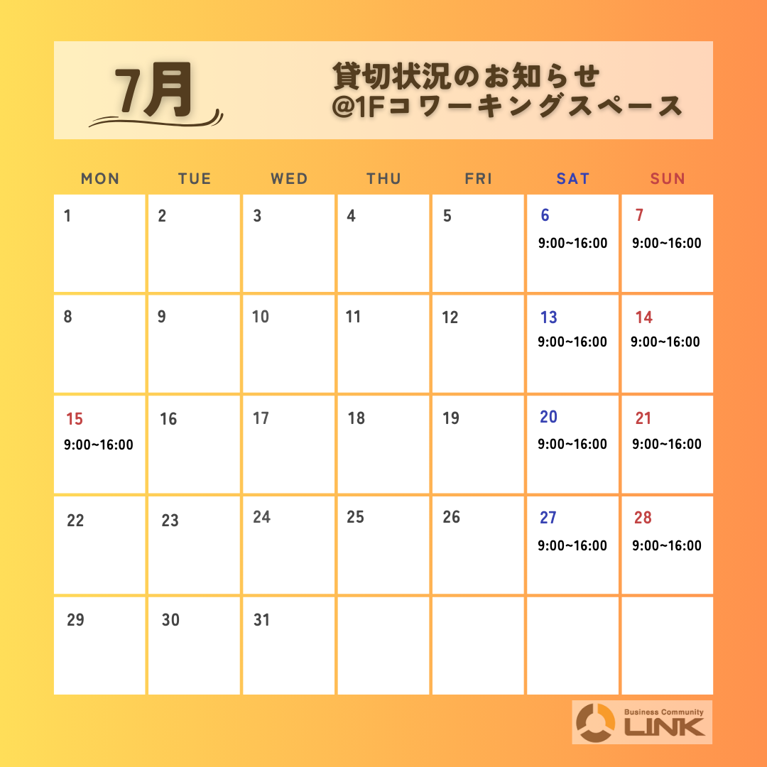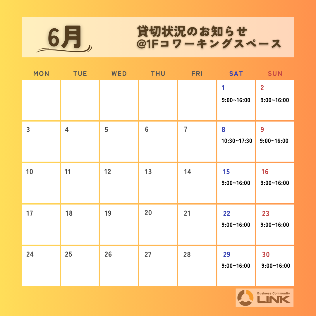 2024年6月,7月の1Fコワーキングスペース貸切状況お知らせです。(5/26時点)