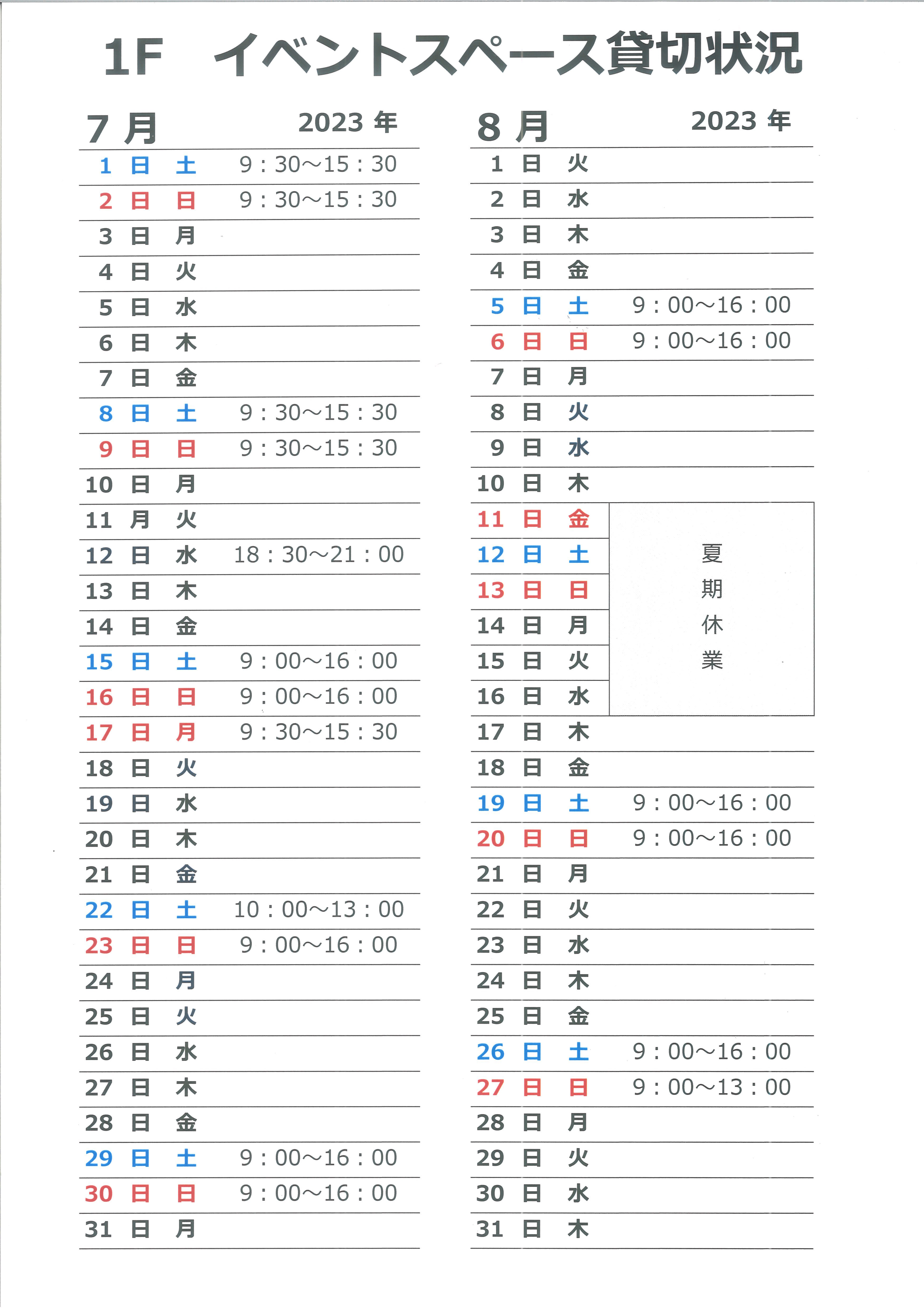 2023年7月, 8月の1Fコワーキングスペース貸切状況お知らせです(7/2現在)