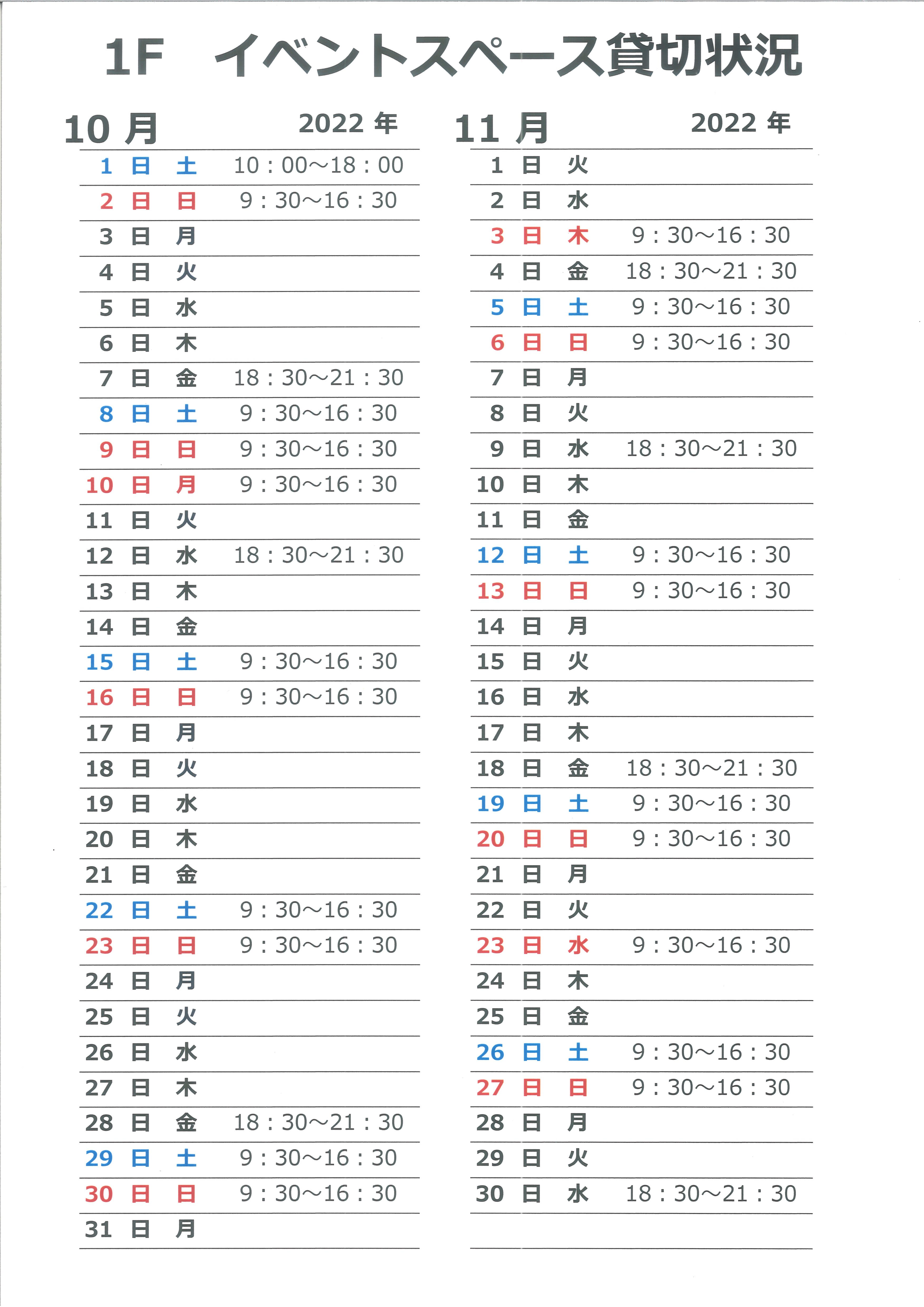 2022年10月, 11月の1Fコワーキングスペース貸切状況お知らせです(9/25現在)