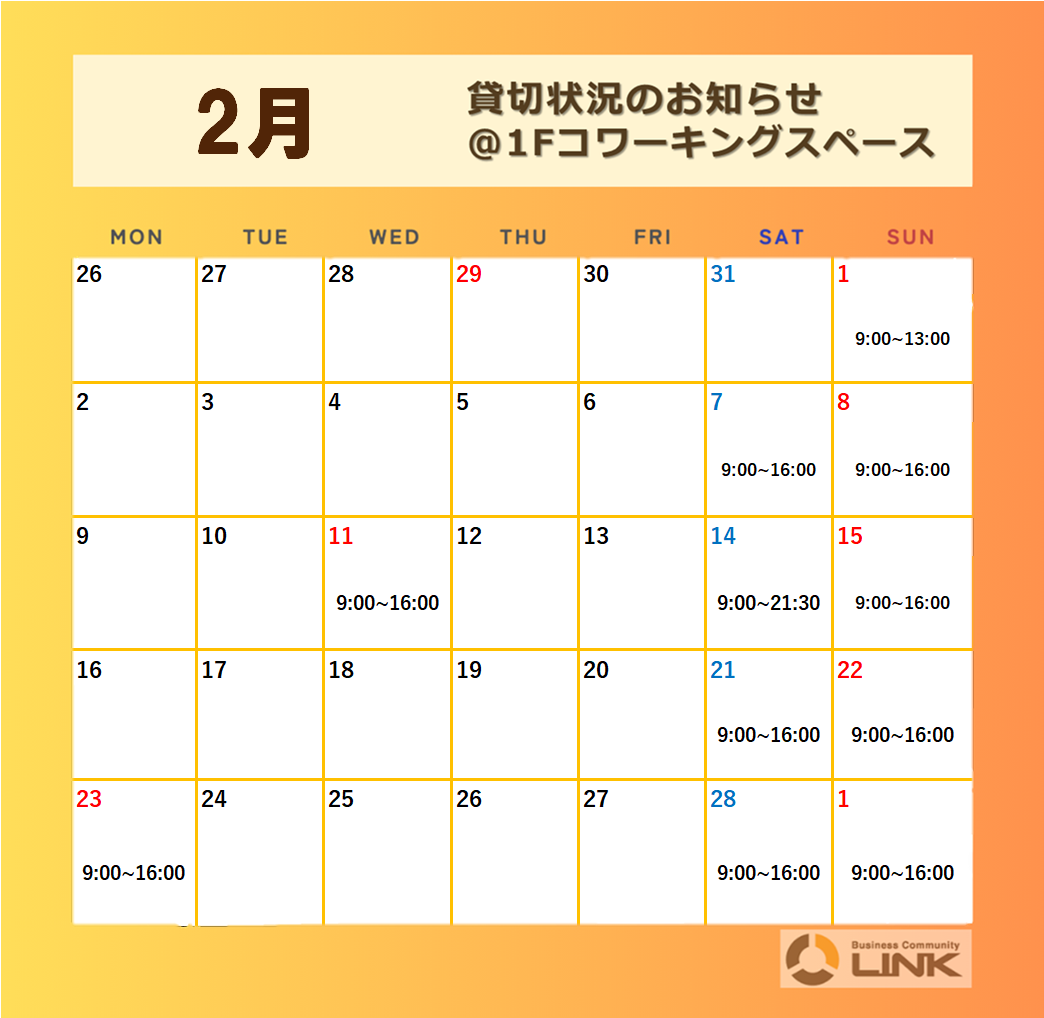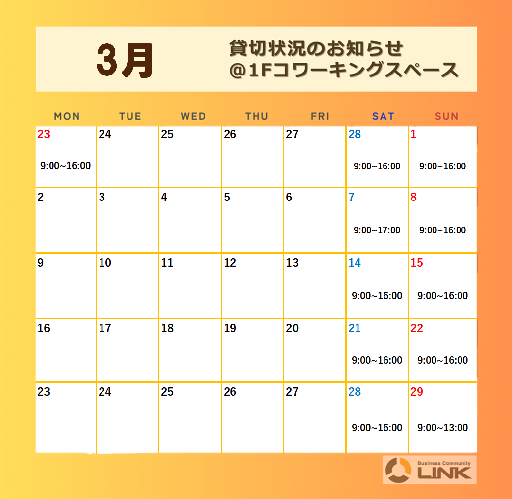 【1Fコワーキングスペース貸切状況のお知らせ📣】