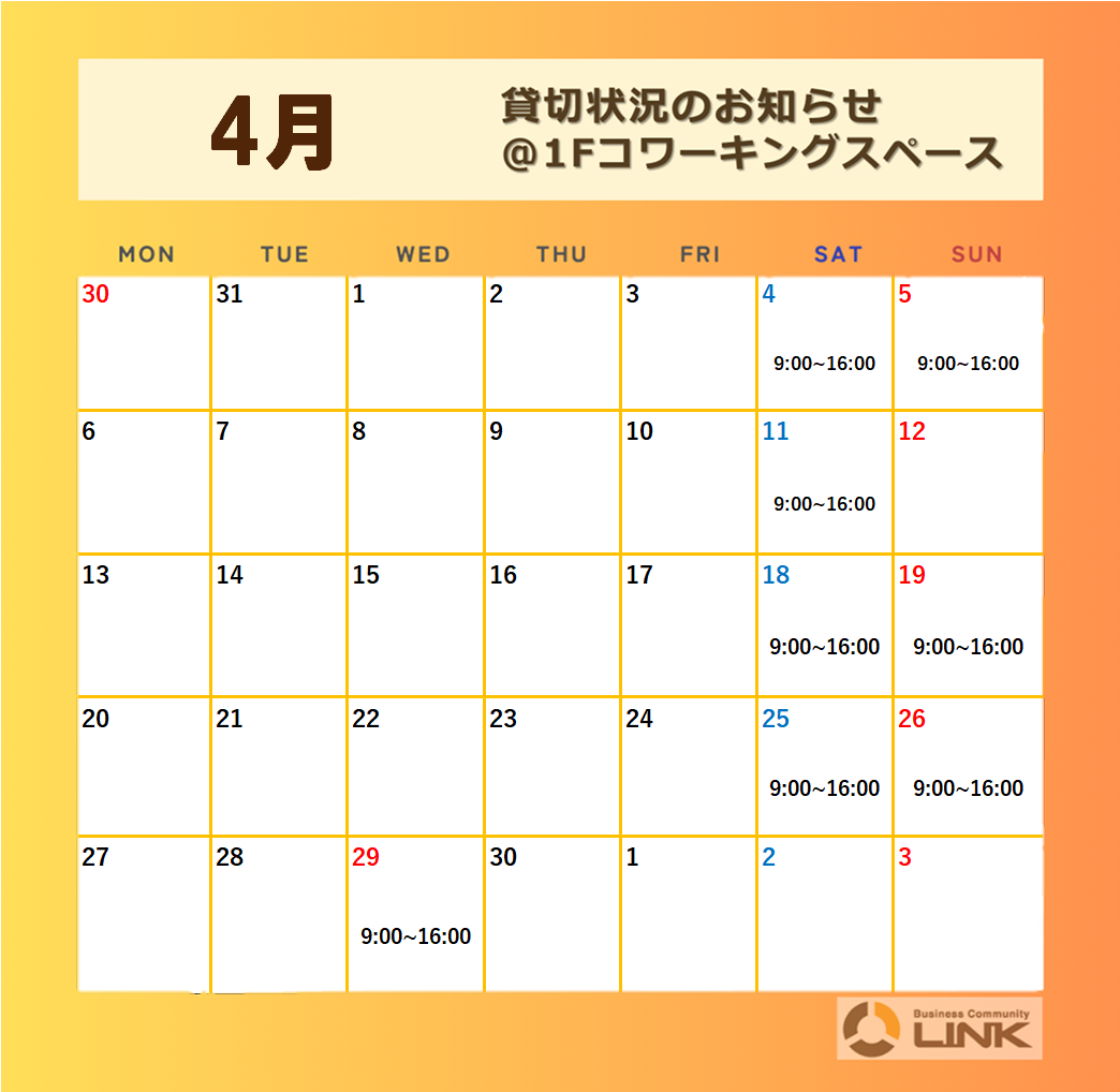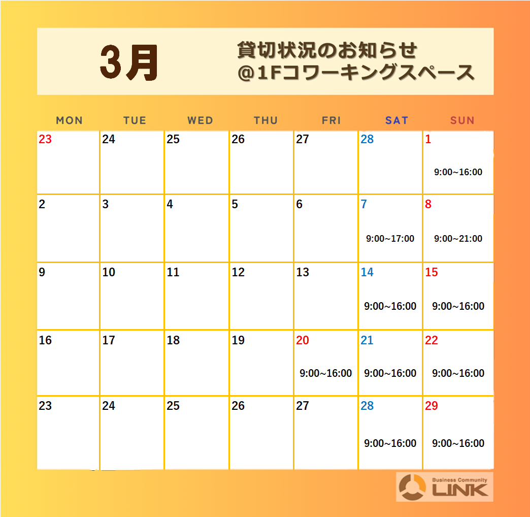【1Fコワーキングスペース貸切状況のお知らせ📣】