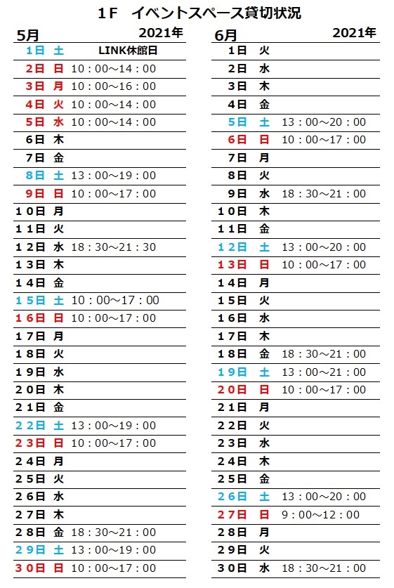 【1F貸切状況のお知らせ】 投稿日: 2021年5月8日2021年5月8日 投稿者: link-staff みなさまお世話になっております。 2021年5月、6月の 1Fコワーキングスペース貸切状況お知らせです。 (5月8日現在) 下記の時間帯は1Fのコワーキングスペースのご利用ができません。 ご不便をおかけいたしますが、どうかご了承くださいますよう お願い申し上げます。 また空室状況により、臨時のコワーキングスペースや 個室を ご用意いたします。 当日、受付までお問い合わせください。 どうぞ宜しくお願いいたします。