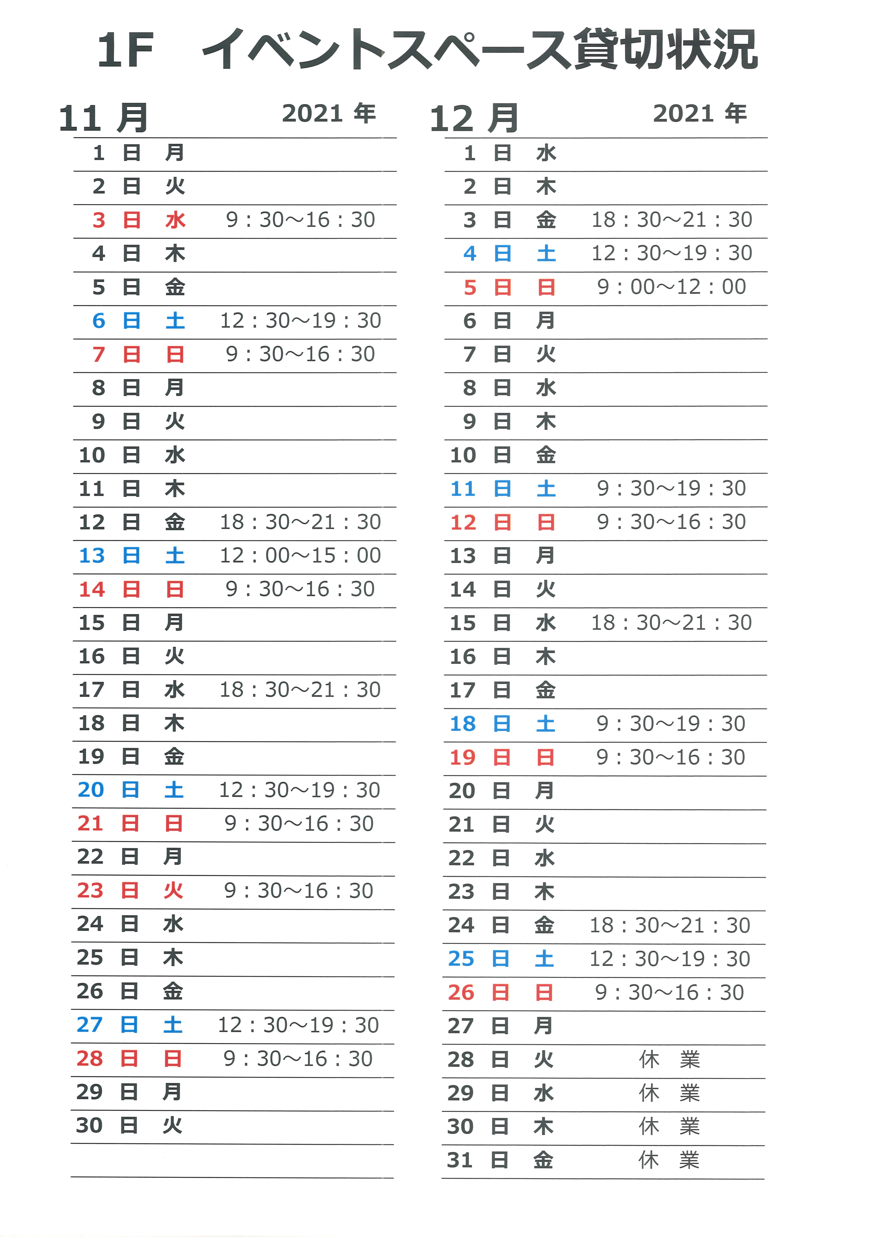 【1F コワーキングスペース 貸切状況】 投稿日: 2021年11月7日2021年11月7日 投稿者: link-staff 【1F コワーキングスペース 貸切状況】 いつもお世話になっております。 11~12月のLINK1Fスペースの貸切状況再投稿致します。 1Fスペースが貸切となりますが、コワーキングとしてご利用のお客様には別のお部屋のご用意をしております。 年末28日からお休みを頂くため、ご利用予定のお客様にはご迷惑をお掛け致しますが、予めご了承のほどお願い致します。