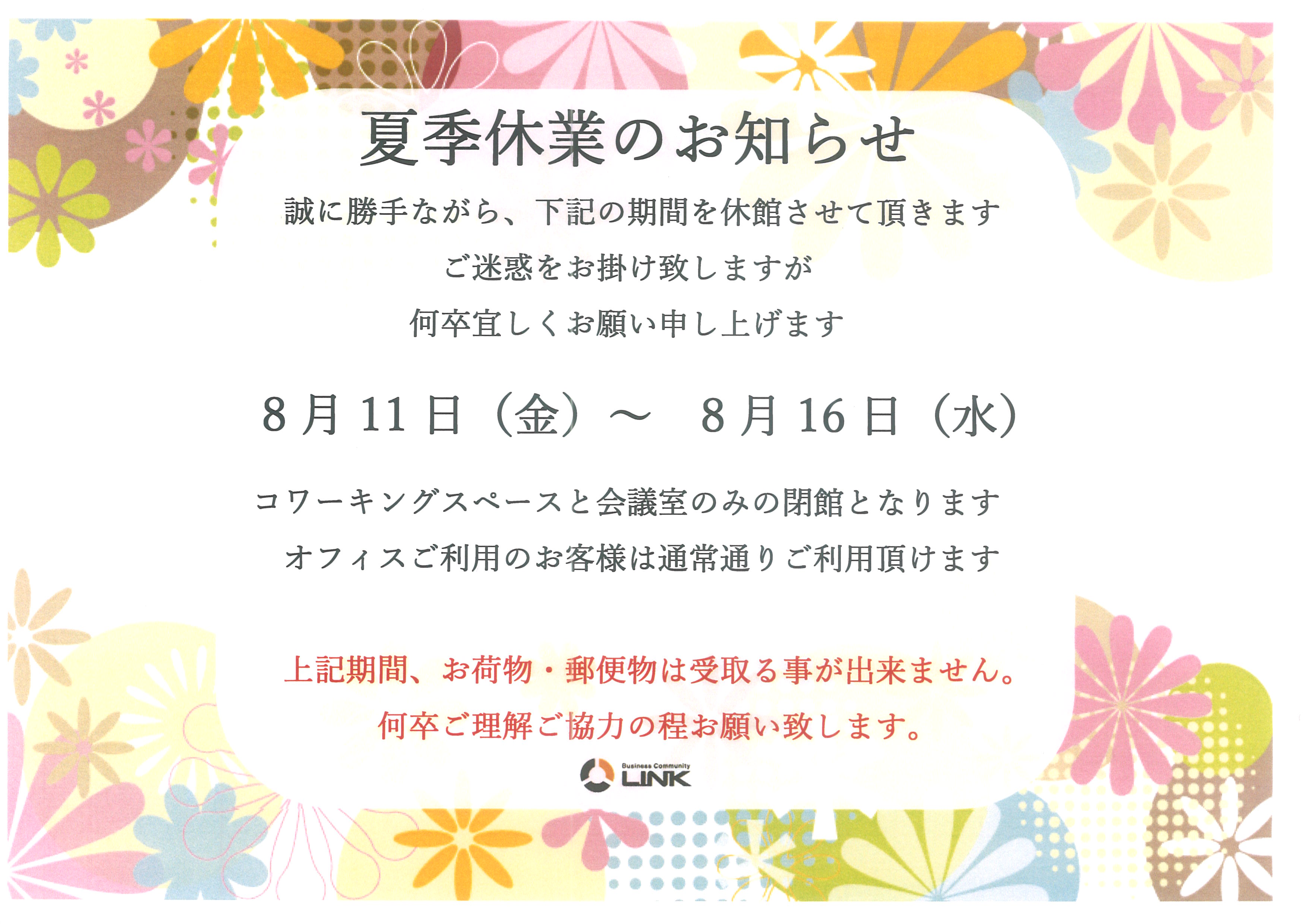 【LINK夏季休業のお知らせ】 投稿日: 2023年7月15日2023年7月15日 投稿者: link-staff いつもお世話になっております。 当施設の夏期休業のご案内をお知らせさせて頂きます。 2023年8月11日(金)~2023年8月16日(水)まで 誠に勝手ながら、上記の期間を休館させていただきます。 ※なお、休館は貸し会議室とコワーキングスペースのみとなり、オフィスの会員様は通常通りご利用頂けます。 何卒宜しくお願い致します。 毎日暑い日が続いていますので、みなさま体調にはお気をつけ下さい。