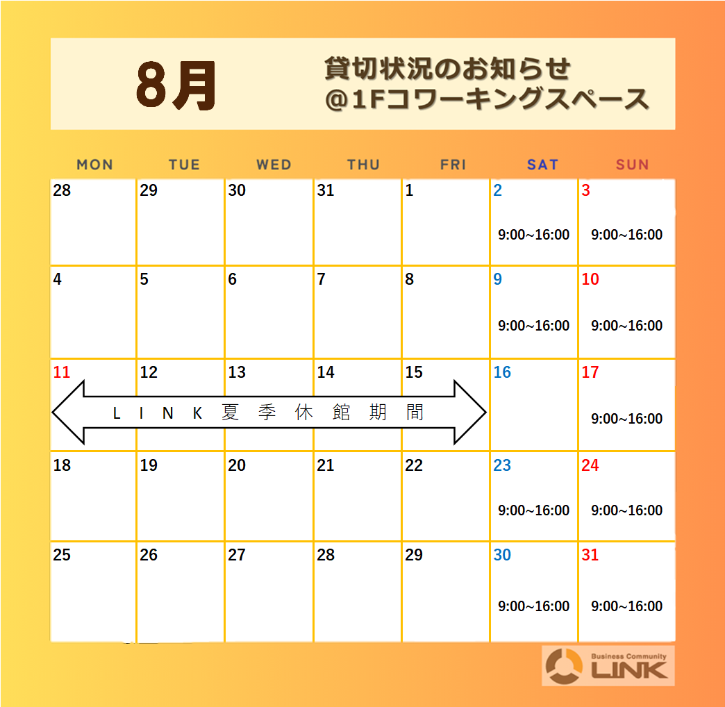 【1Fコワーキングスペース貸切状況のお知らせ📣】 投稿日: 2025年6月27日2025年6月27日 投稿者: link-staff 7月と8 月は画像のような貸切状況となっております 〜 コワーキングスペースご利用希望のお客様へ 〜 貸切予約が入っている時間帯は、臨時コワーキングスペースを別室にご用意いたします 当日に受付までお問い合わせくださいませ。(※空室状況によりご案内できない場合がございます) ご不便をおかけしますが、どうかご了承くださいますようお願い申し上げます。