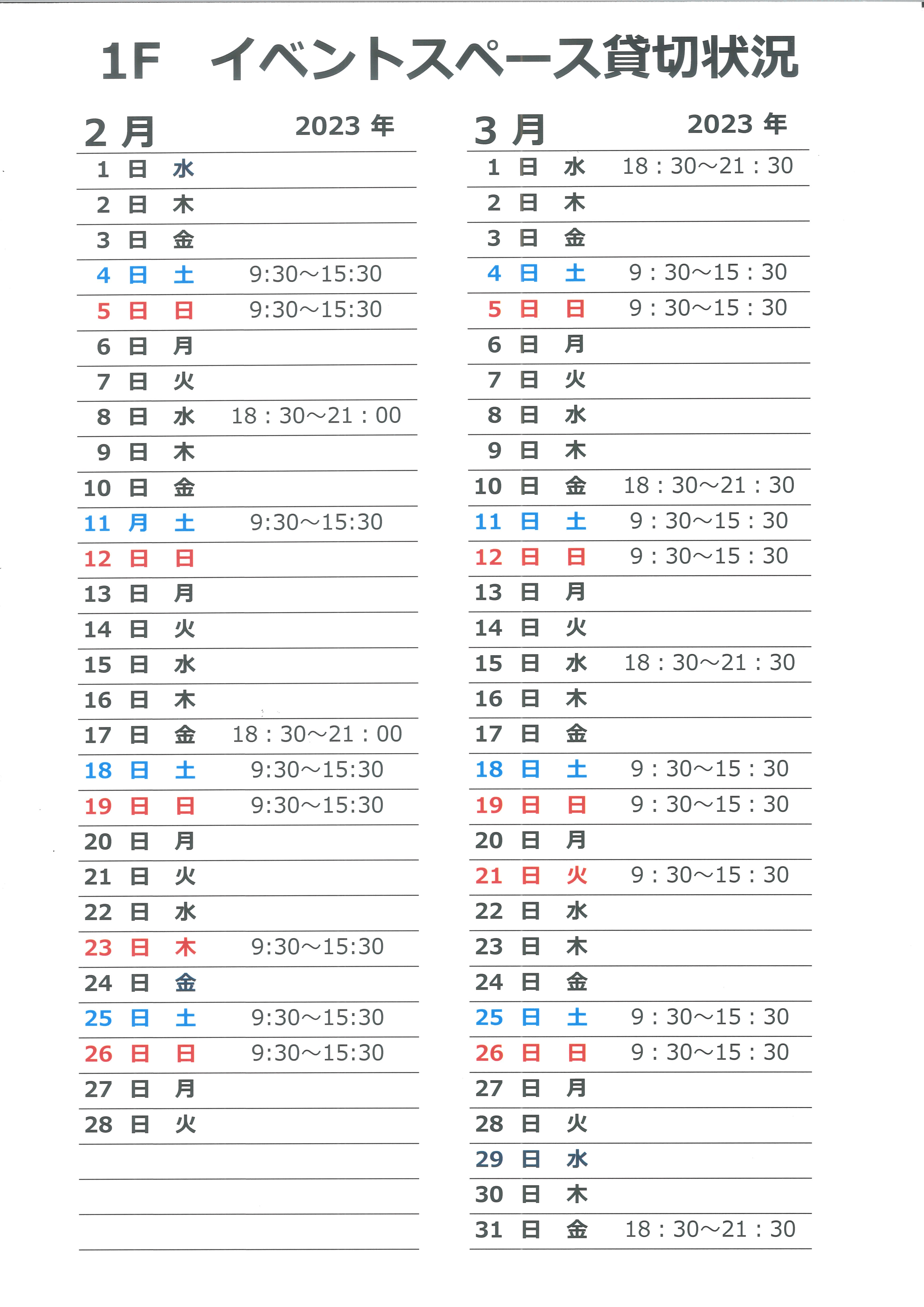 2023年2月, 3月の1Fコワーキングスペース貸切状況お知らせです(1/28現在)
