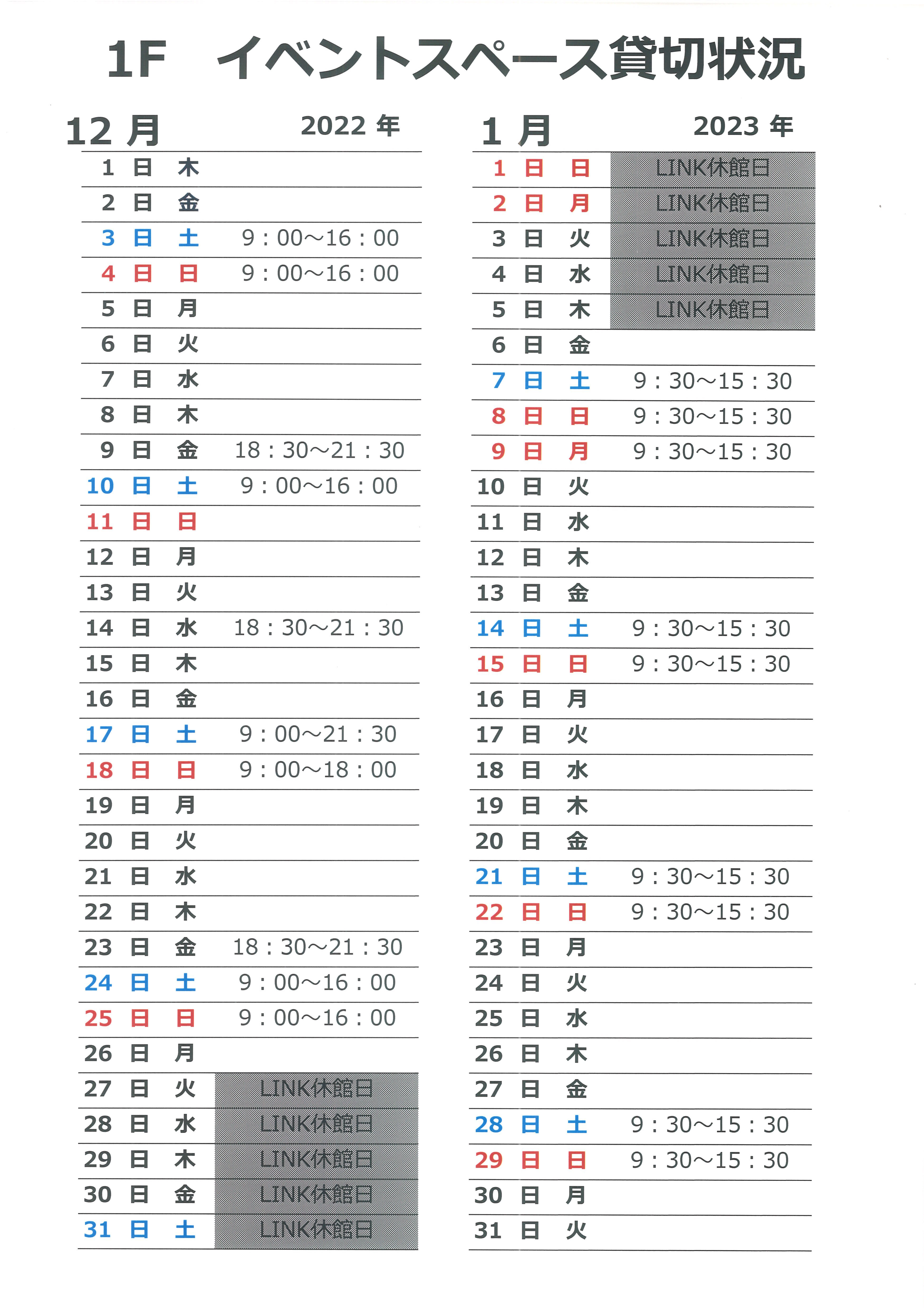 2022年12月, 2023年1月の1Fコワーキングスペース貸切状況お知らせです(12/4現在)