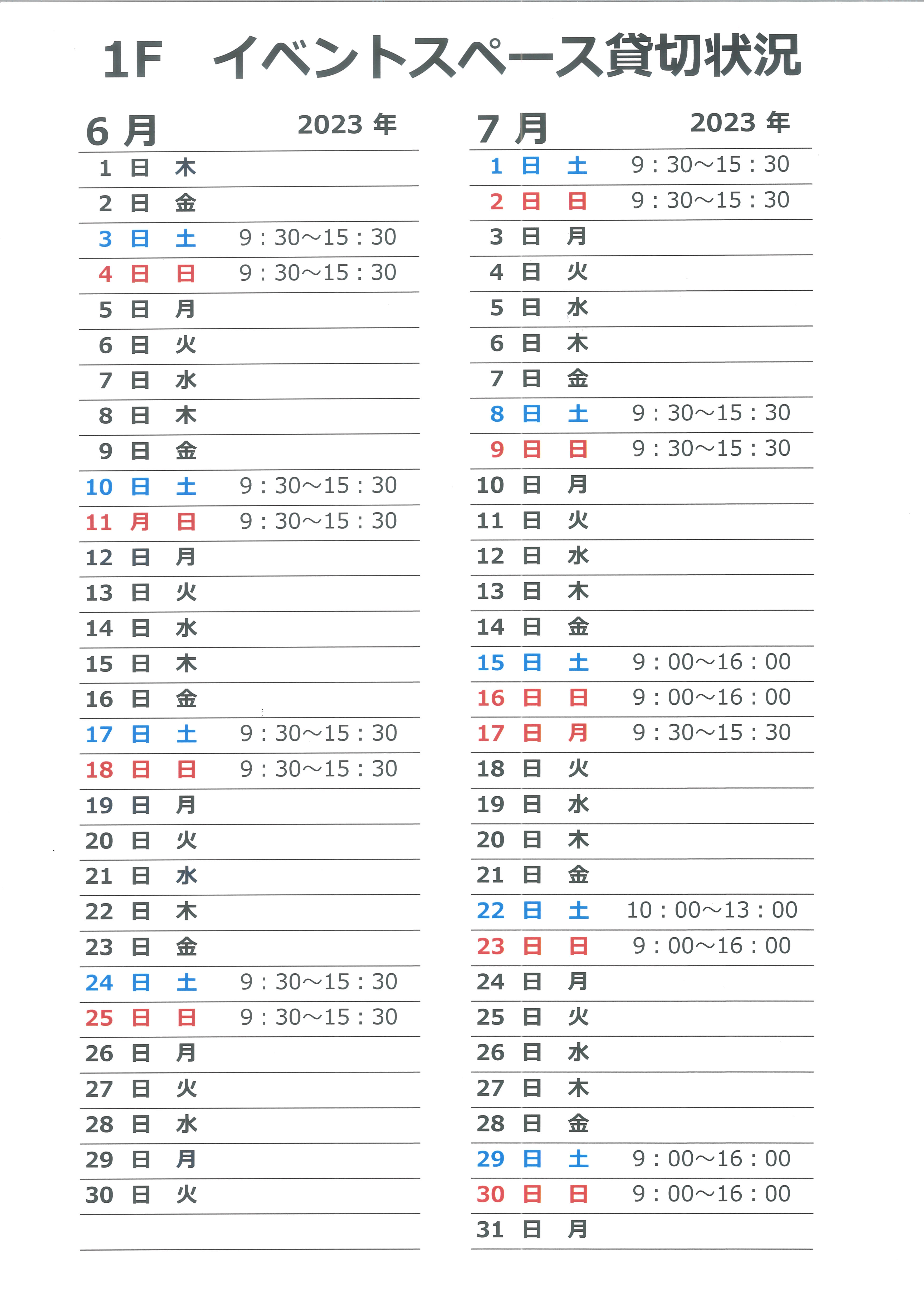 2023年6月, 7月の1Fコワーキングスペース貸切状況お知らせです(5/27現在)