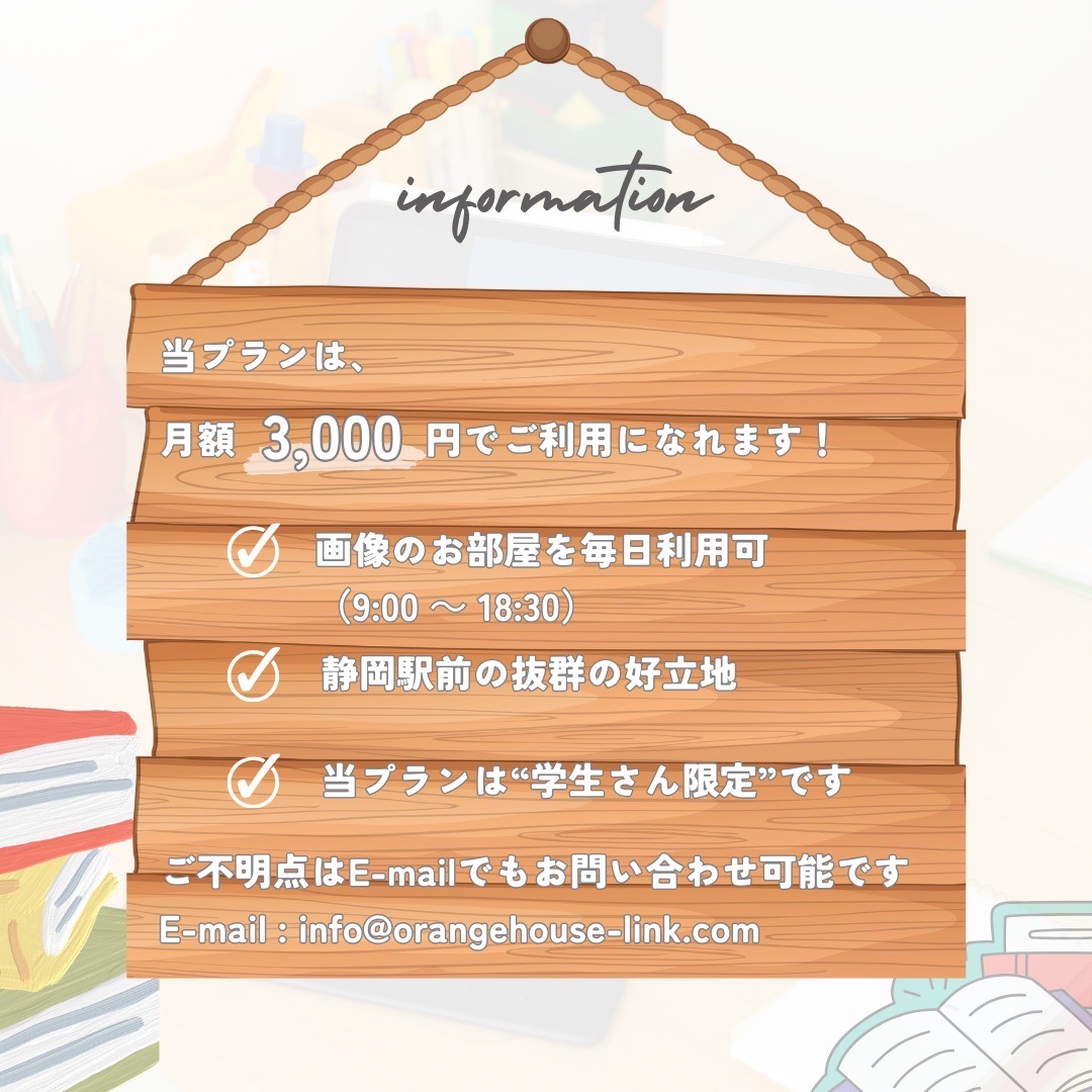 この度『学生プラン』を開始します! 投稿日: 2024年6月4日2024年6月4日 投稿者: link-staff こんにちは。LINKからお知らせです! この度『学生プラン』を開始します✒️ 月額3,000円で、毎日LINKを使って集中してお勉強することができます⭕️ 当プランは学生さんのみ対象となります。 ご不明点等がありましたら、お気軽にご連絡くださいね😄 E-mail : info@orangehouse-link.com TEL: 054-251-7719