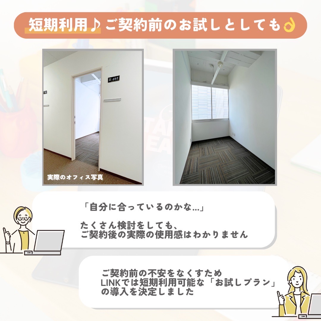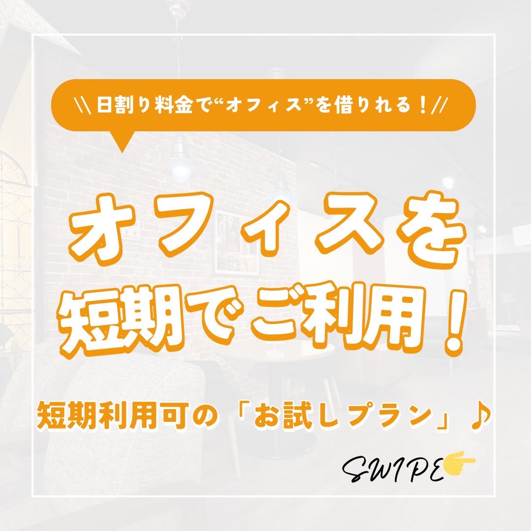 短期利用可能な『オフィスお試しプラン』を開始します 投稿日: 2024年6月4日2024年6月4日 投稿者: link-staff こんにちは。LINKからお知らせです! この度、オフィスを短期利用可能な『オフィスお試しプラン』を開始します✒️ 以下から、ご希望の利用期間をお選びください🎶 ✅1day ✅1week ✅1month プランに関して、ご不明点等がございましたら、お気軽にご連絡くださいね😄 E-mail : info@orangehouse-link.com TEL: 054-251-7719