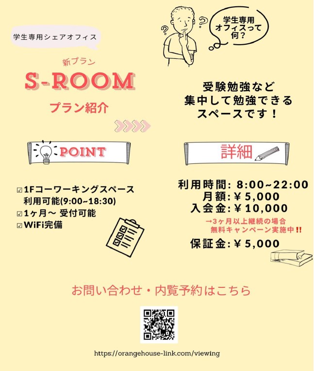 【✨新プラン📣学生専用シェアオフィス S-ROOM✨】 投稿日: 2025年10月11日2025年10月11日 投稿者: link-staff ✨新プラン S-ROOM 誕生✨ 学生専用シェアオフィス S-ROOMは集中して勉強できるスペースです。 駅前、格安で夜まで利用できる自習室が欲しい!切磋琢磨できる仲間が欲しい! そんな学生の方にススメです♪ 内覧予約はこちらから ↓↓↓ お気軽にどうぞ! https://orangehouse-link.com/viewing
