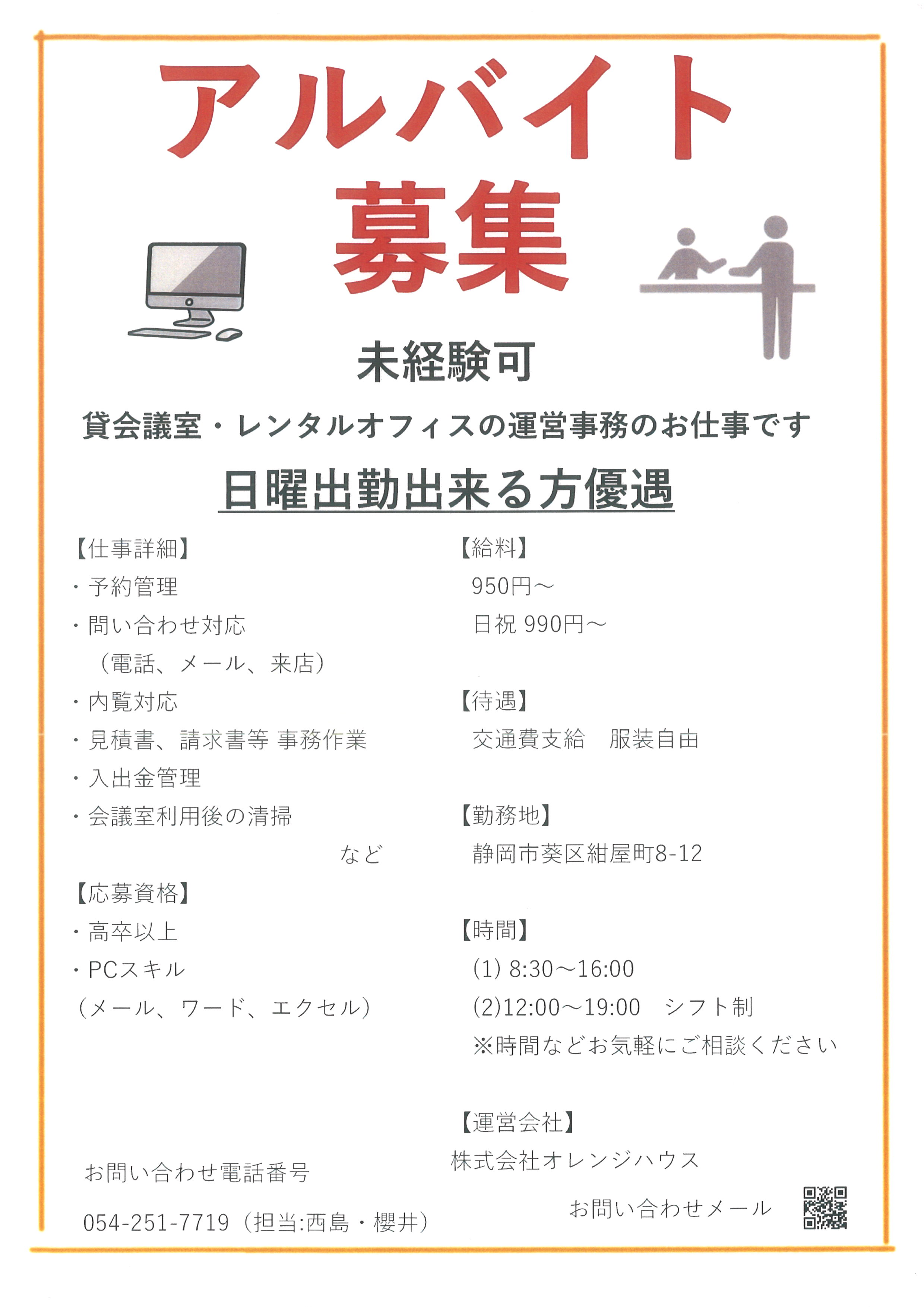 【アルバイト募集】 投稿日: 2022年9月18日2022年9月18日 投稿者: link-staff 静岡駅前会議室LINKでございます。 この度LINKで一緒に働いてくれる仲間を募集いたします。 特に日曜日に出勤できる方大歓迎です。 詳しい内容は下記をご覧下さい。 メールでのお問い合わせは info@orangehouse-link.comまでお願いいたします。 ご応募お待ちしております。