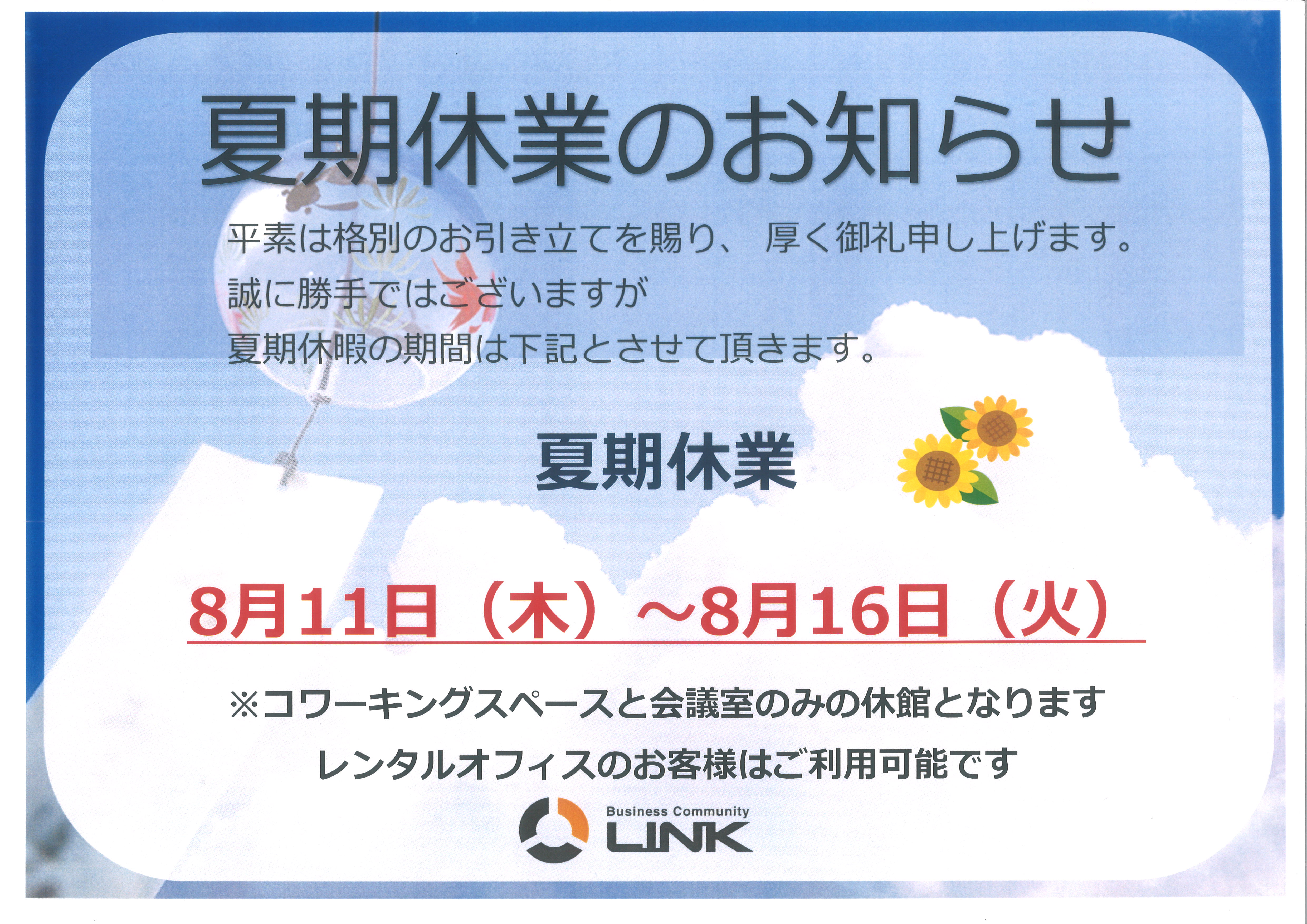 【夏季休業お知らせ】 投稿日: 2022年7月10日2022年7月10日 投稿者: link-staff いつもお世話になっております。 当施設の夏季休業のご案内です。 2022年8月11日(木)~2022年8月16日(火)まで 誠に勝手ながら、上記の期間を休館させていただきます。 ※なお、休館は貸し会議室とコワーキングスペースのみとなり、オフィスの会員様は通常通りご利用頂けます。 何卒宜しくお願い致します。