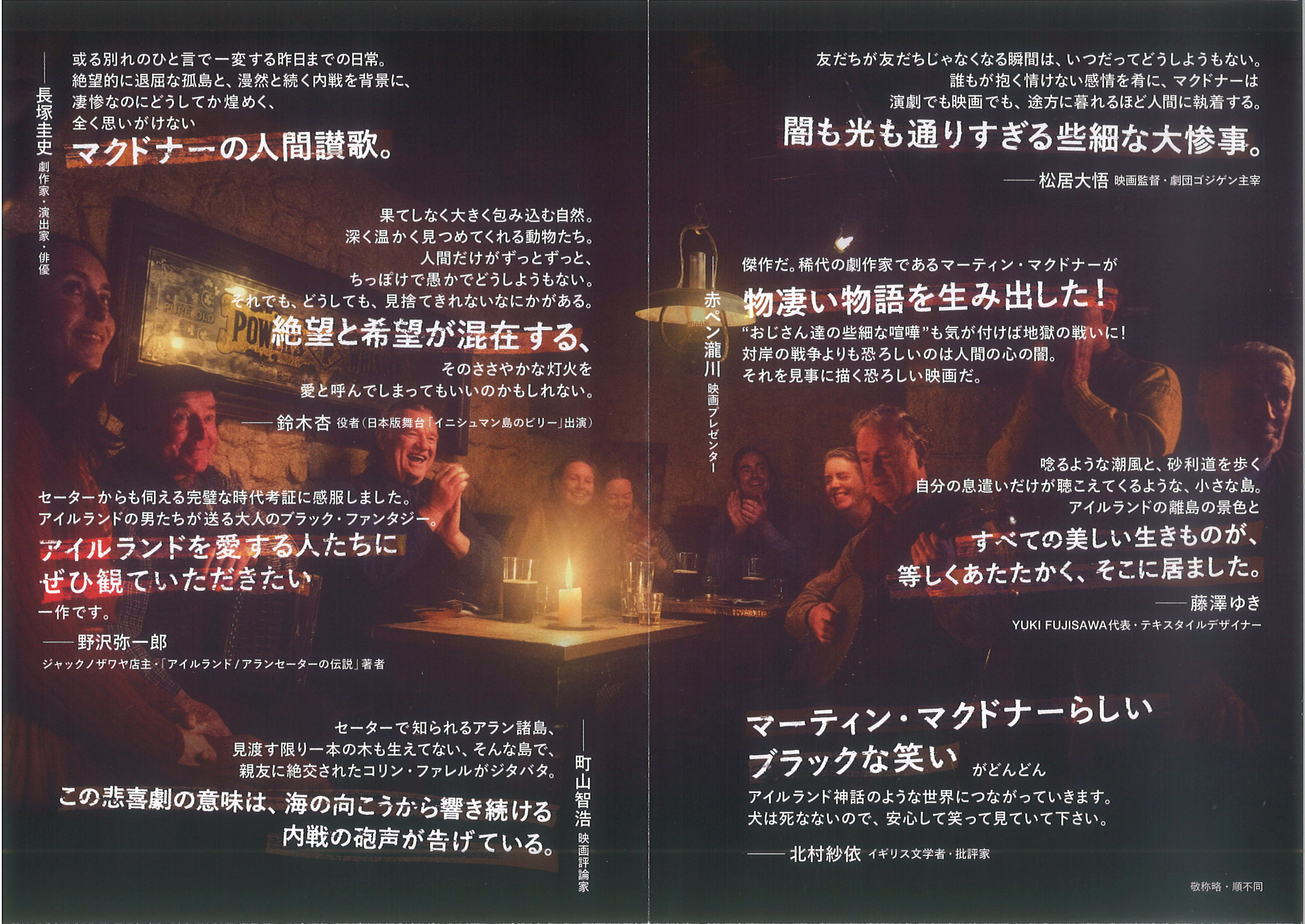 【映画パンフレットコメント記載】 投稿日: 2023年1月14日2023年1月14日 投稿者: link-staff こんにちは。 ビジネスコミュニティLINKでございます。 1月27日金曜日より静岡シネギャラリーさんで上映予定の 「イニシェリン島の精霊」。 他にも静岡県内ではTOHOシネマズららぽーと磐田/シネプラザサントムーン/シネマサンシャイン沼津 で上映予定。 そのパンフレットにLINK会員のジャックノザワヤ 野沢様のコメントが採用され掲載されています‼ 是非会場まで足を運んで下さいませ。