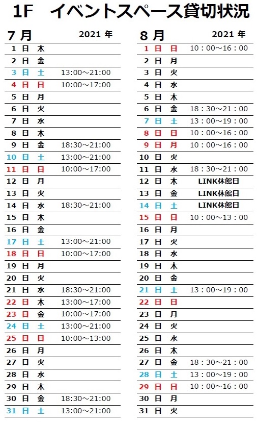 【1F コワーキングスペース 貸切状況】 投稿日: 2021年7月23日2021年7月23日 投稿者: link-staff 【1F コワーキングスペース 貸切状況】 いつもお世話になっております。 7~8月のLINK1Fスペースの貸切状況です。 (7/23現在) 1Fスペースが貸切となりますが、コワーキングとしてご利用のお客様には別のお部屋のご用意をしております。 ご利用予定のお客様にはご迷惑をお掛け致しますが、予めご了承のほどお願い致します。