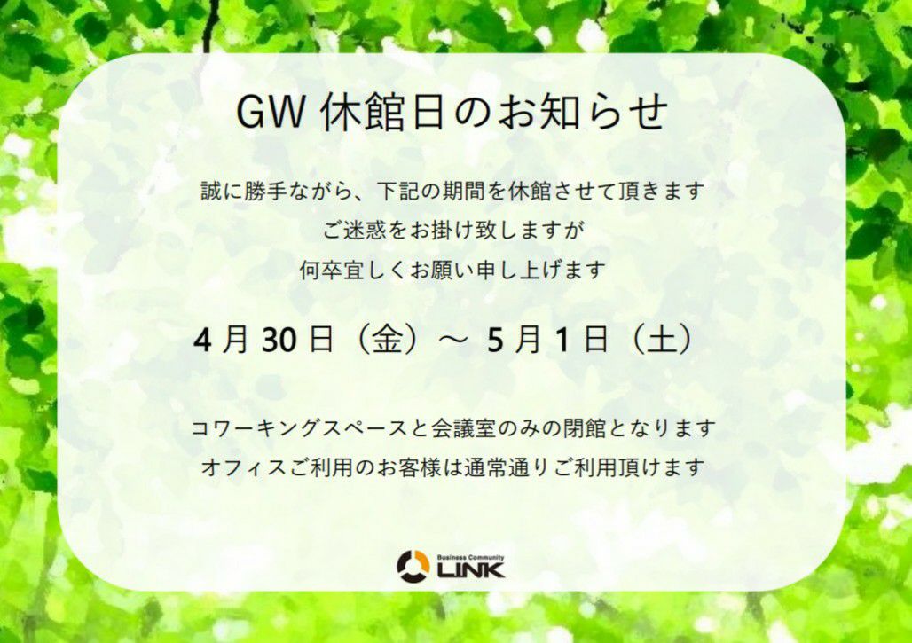 【GWに伴う休館日のお知らせ】 投稿日: 2021年3月23日2021年3月23日 投稿者: link-staff 【GWに伴う休館日のお知らせ】 いつもお世話になっております。 2021年4月30日(金)~5月1日(土) 誠に勝手ながら、上記の期間を休館とさせて頂きます。 ※会議室・コワーキングスペース のみ休館となり、オフィスはご利用頂けます。 何卒宜しくお願い申し上げます。