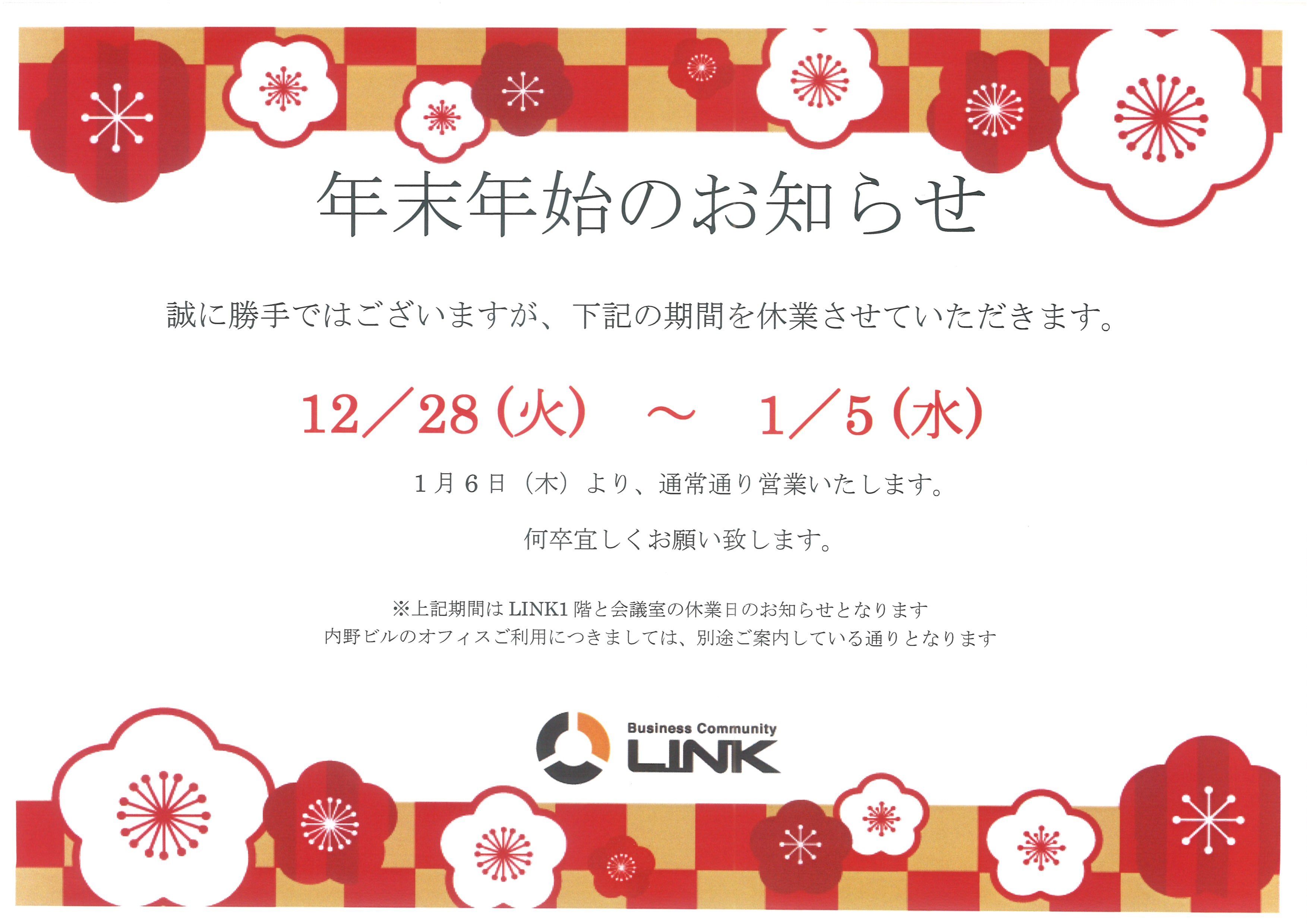 年末年始休業のお知らせ 投稿日: 2021年11月20日2021年11月20日 投稿者: link-staff 年末年始休業のお知らせです。 2021年12月28日~2022年1月5日まで休業といたします。 お客様には大変ご不便をおかけいたしますが、予めご理解のほど宜しくお願いいたします。