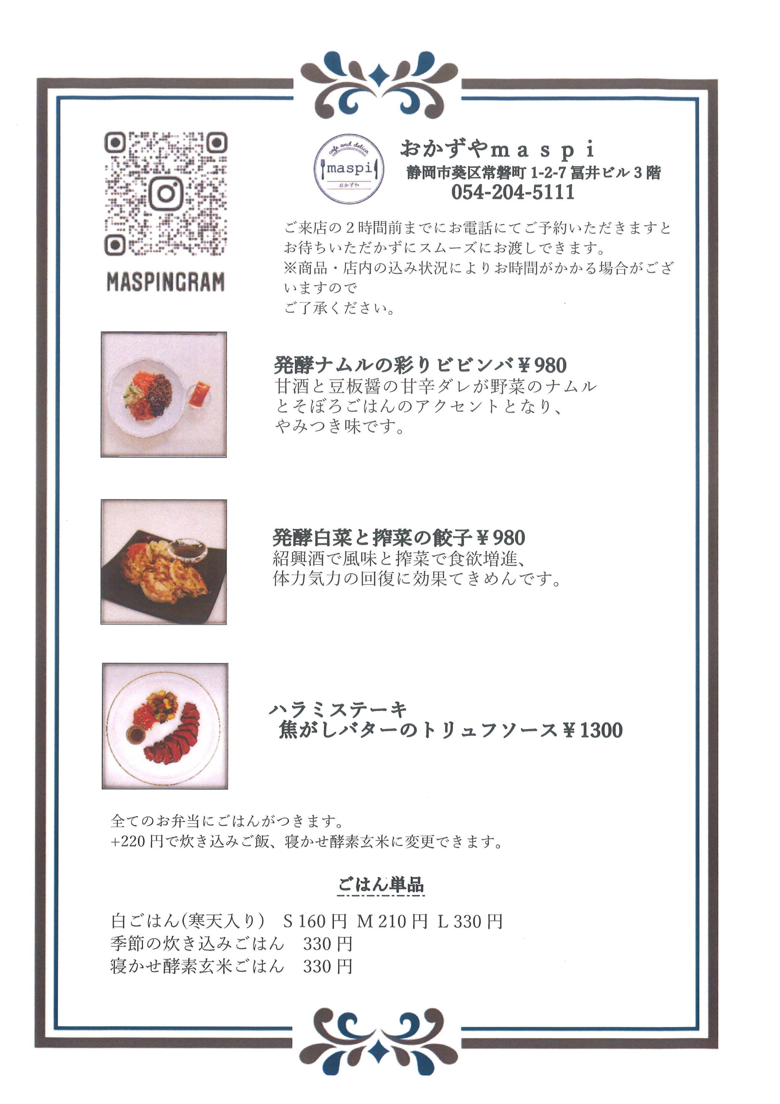 LINKおすすめ店 TAKEOUTメニュー 投稿日: 2021年7月4日2021年7月14日 投稿者: link-staff お世話になっております。 ビジネスコミィニティーLINKでございます。 会議室ご利用のお客様など、まとめてお弁当をご注文したい方におススメ‼ TAKEOUTメニューのご紹介です。 常磐町にある「おかずやmaspi」さんのヘルシーごはんでランチはいかがでしょうか? 1万円以上で配達も可能です。 ご注文は直接「おかずやmaspi」さんにご連絡お願い致します。 メニューはこちらです。 ↓ ↓ ↓ ↓ ↓