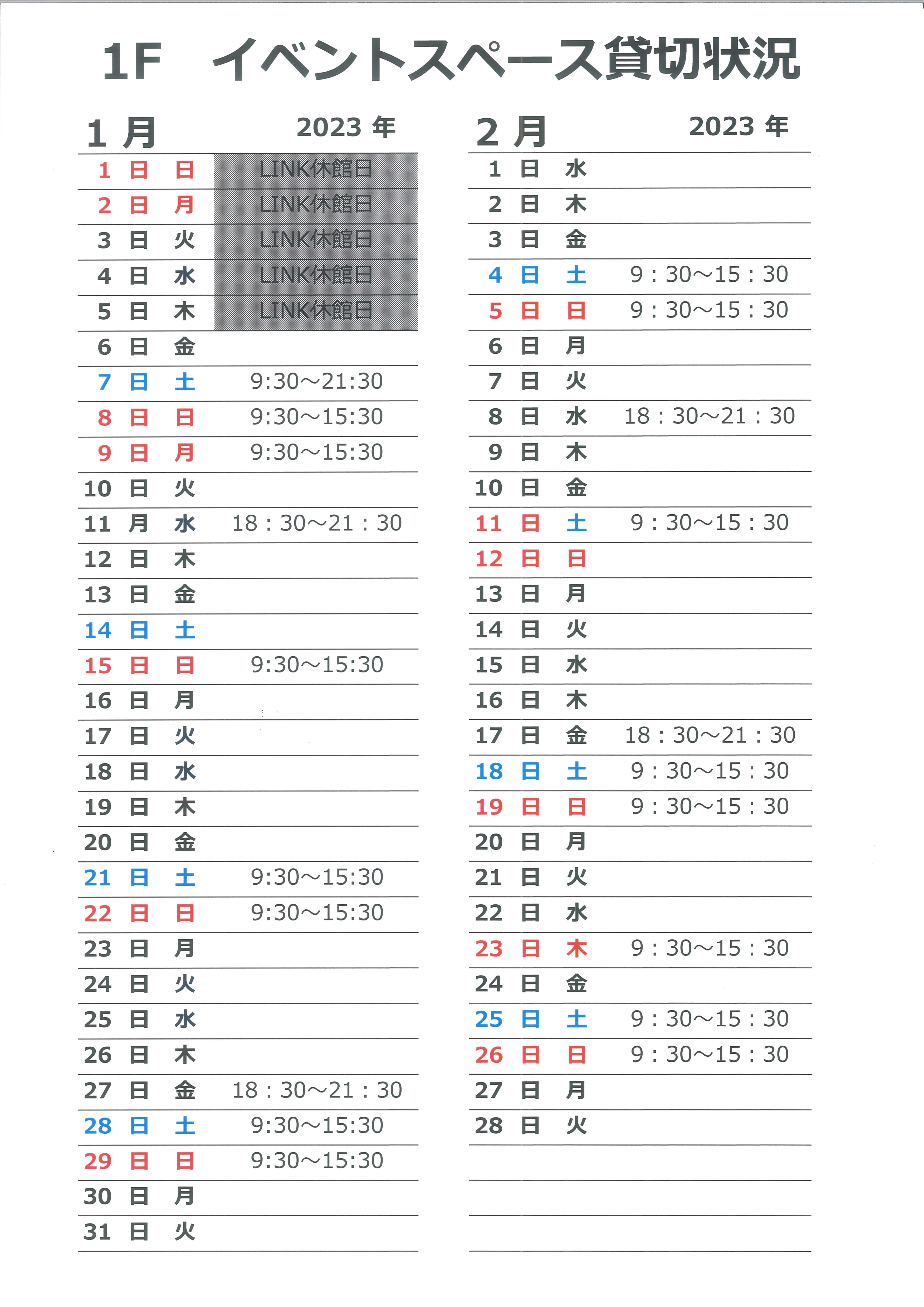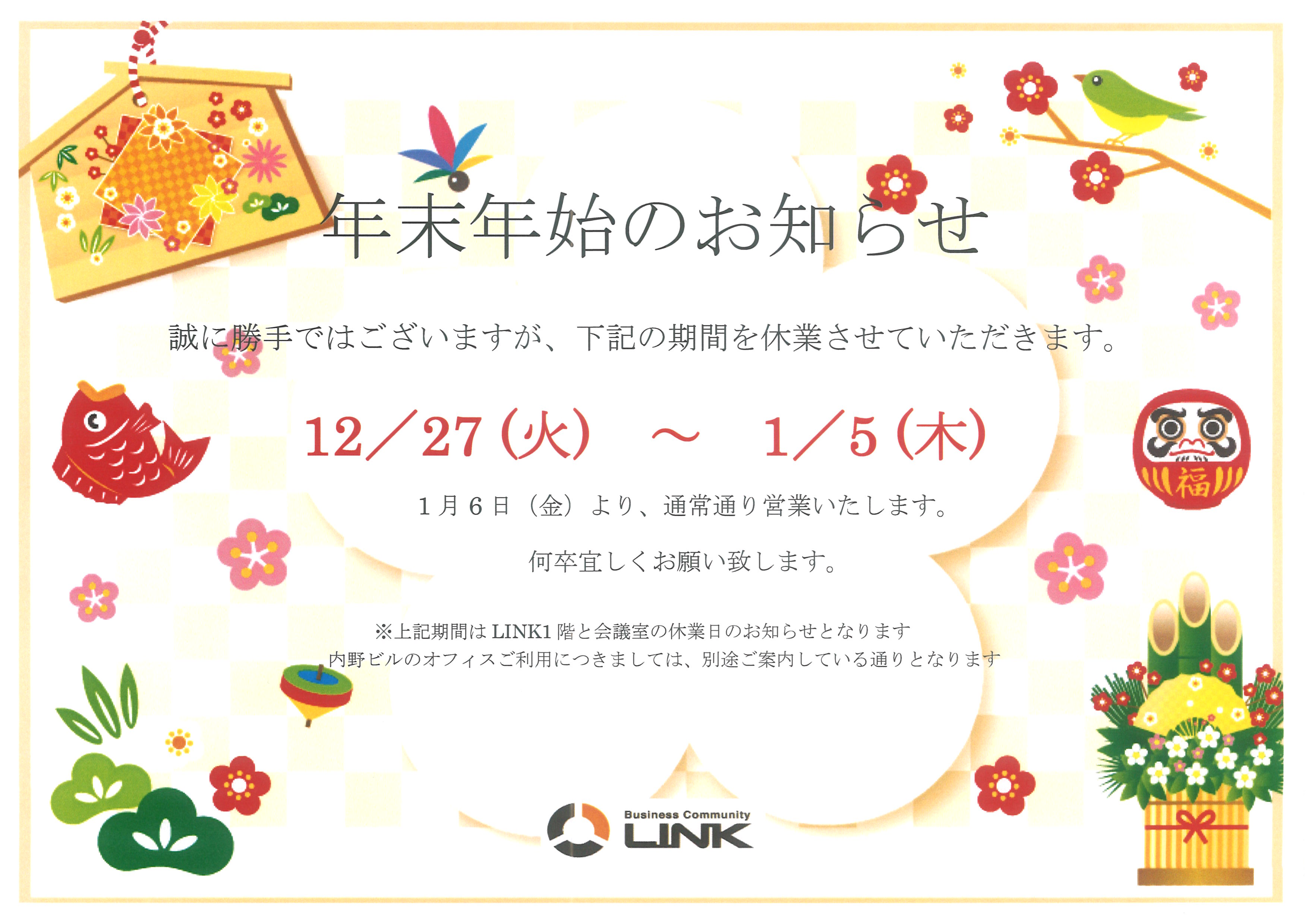 【年末年始の休業案内と1Fコワーキングスペース貸切状況】 投稿日: 2022年12月24日2022年12月24日 投稿者: link-staff みなさまお世話になっております。 2023年1月、2月の 1Fコワーキングスペース貸切状況お知らせです(12月24日現在) 下記の時間帯は1Fのコワーキングスペースのご利用ができません。 ご不便をおかけいたしますが、どうかご了承くださいますよう お願い申し上げます。 また空室状況により、臨時のコワーキングスペースや 個室を ご用意いたします。 当日、受付までお問い合わせください。 どうぞ宜しくお願いいたします。 今年も皆様には大変お世話になり、誠にありがとうございました。 来年は良い一年になる事を願っております。 どうぞ来年も宜しくお願い致します。