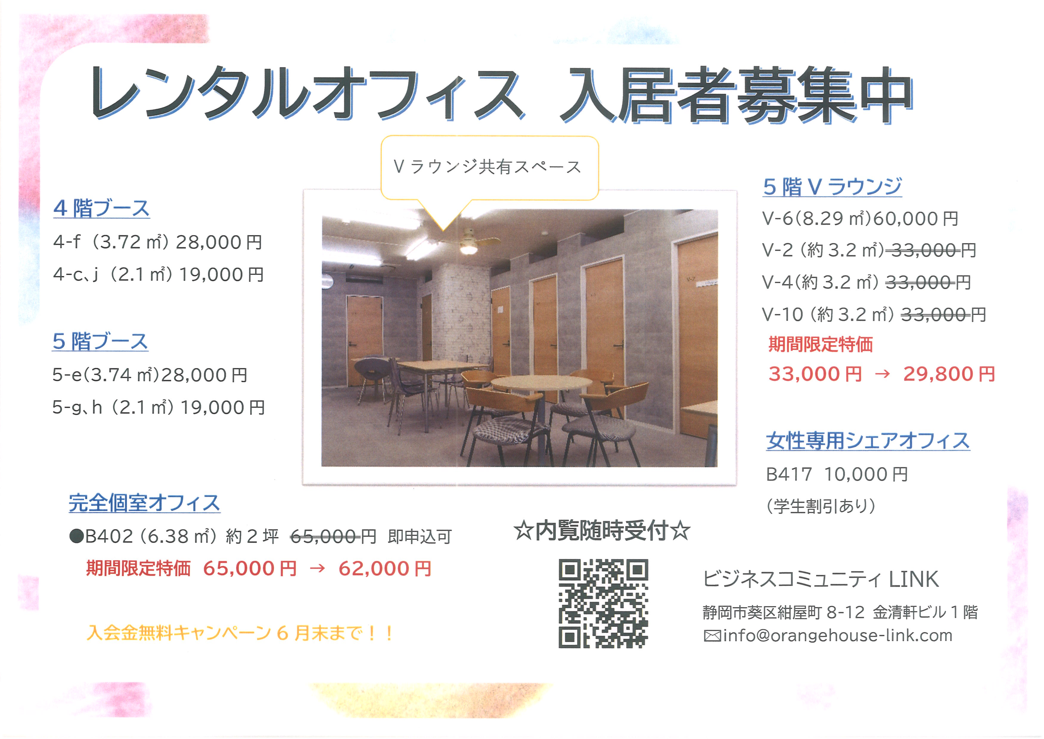 【☆入居者募集☆】 投稿日: 2023年6月4日2023年6月4日 投稿者: link-staff お世話になっております。 静岡駅前会議室LINKでございます。 梅雨前線と台風の影響で各地で被害が出ておりますが、 皆様のご無事と、被害にあわれた方が1日でも早く日常生活を取り戻せる事を願っております。 さて、今年も早いもので半分終わってしまいますね💦 4月からの入会金無料キャンペーンも6月いっぱいで終わりになります。 空いているお部屋もオフィスは残り1部屋になり、他のお部屋も少なくなってきております。 この機会にご検討下さいませ。