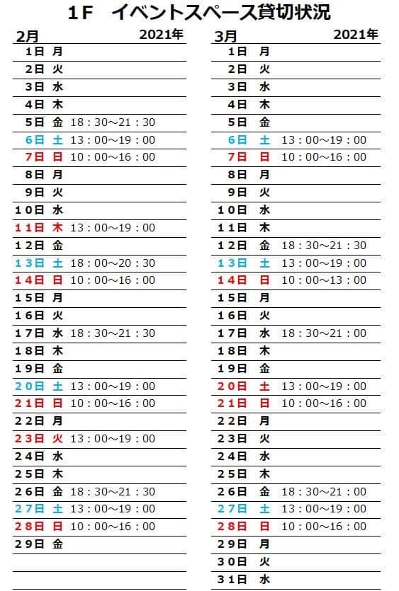 みなさまお世話になっております。 2021年2月、3月の 1Fコワーキングスペース貸切状況お知らせです。 (2月6日現在)
