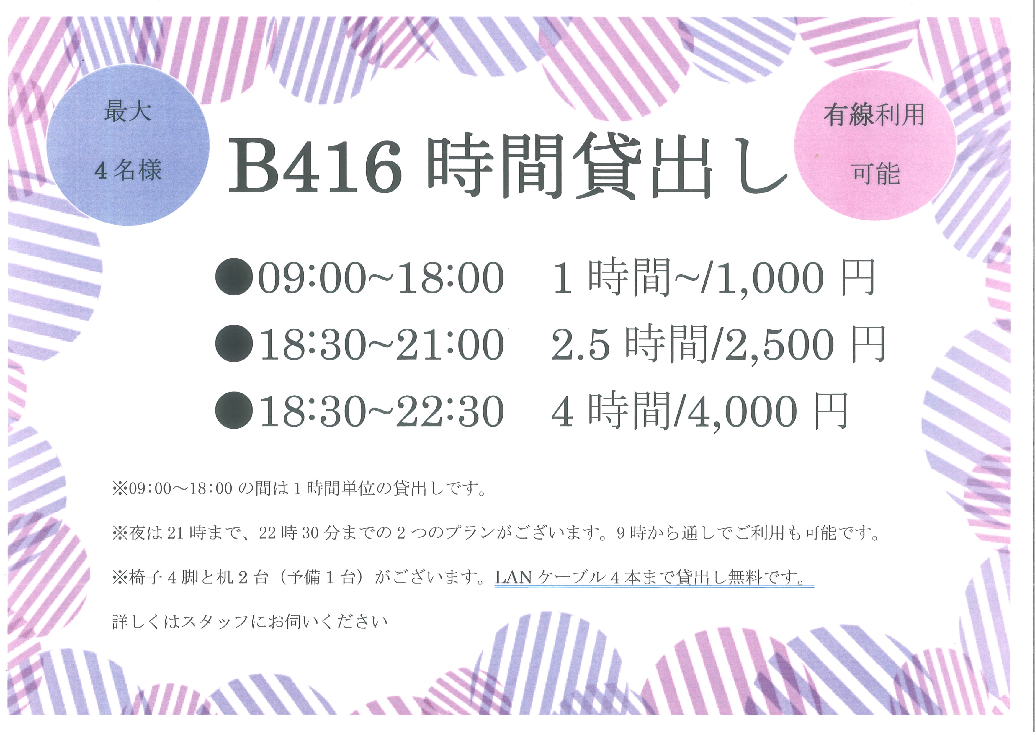 (LANケーブルは4本まで無料で貸出可能です。予約時に備品のご予約お願い致します。)