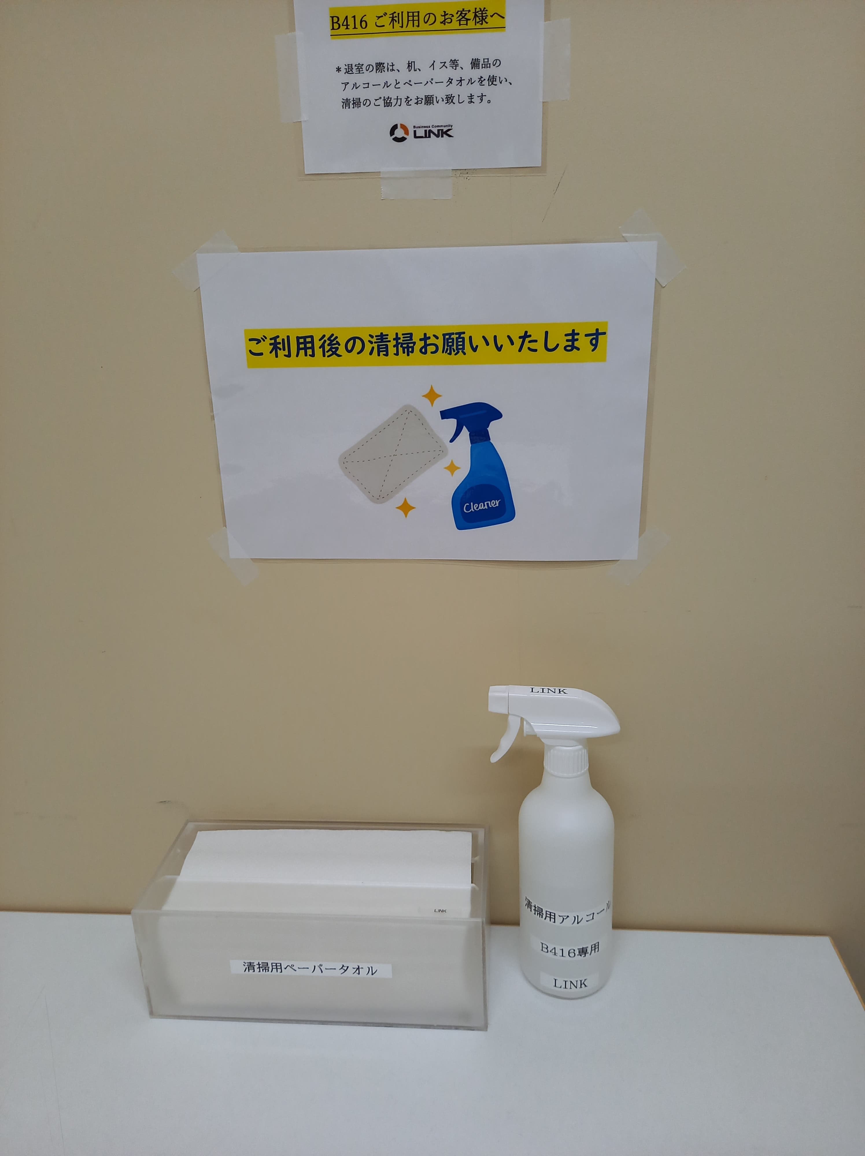 ご利用後はお部屋に備え付けのアルコール消毒とペーパータオルで机、椅子などの清掃をお願い致します。