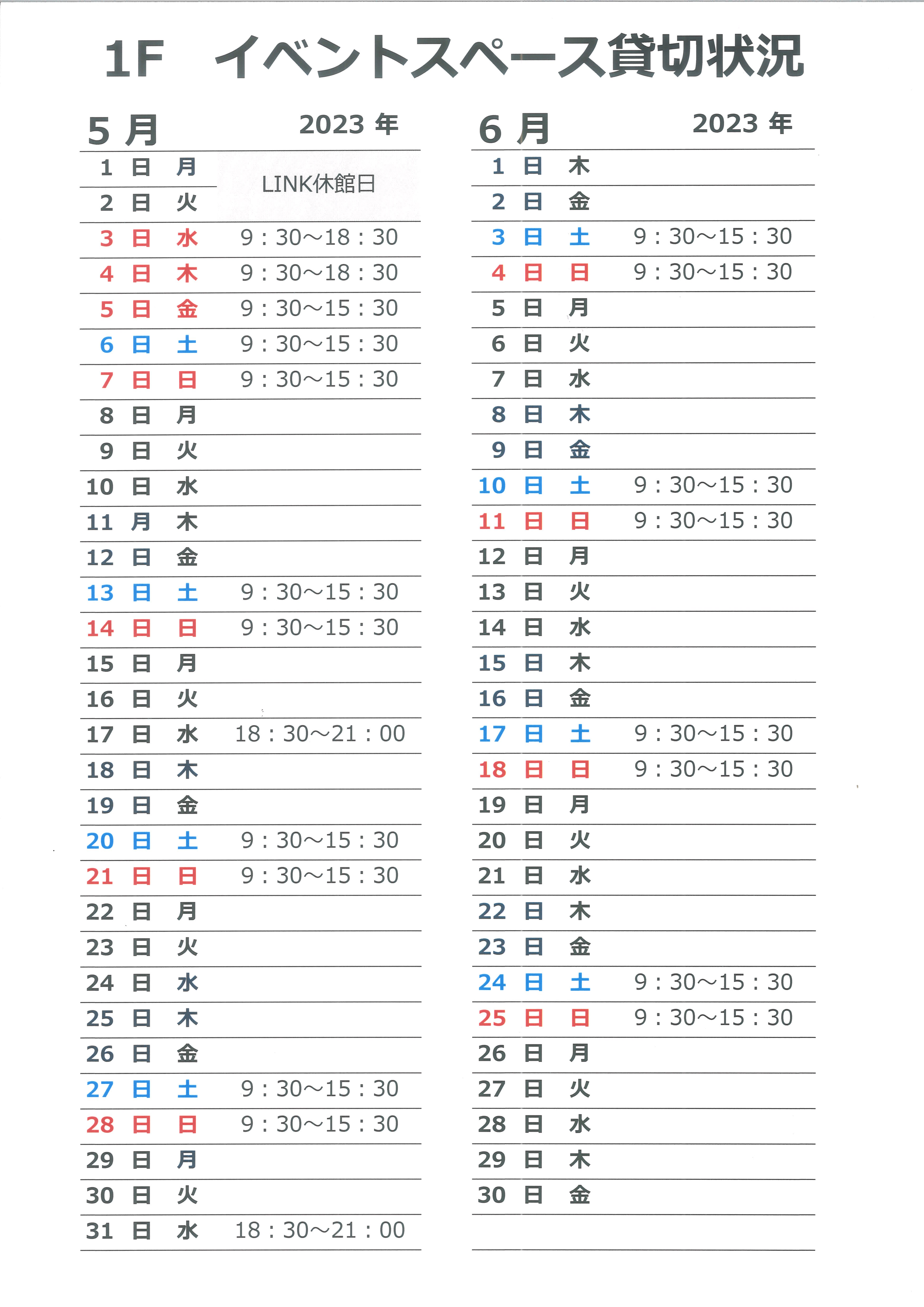 2023年5月, 6月の1Fコワーキングスペース貸切状況お知らせです(4/26現在)