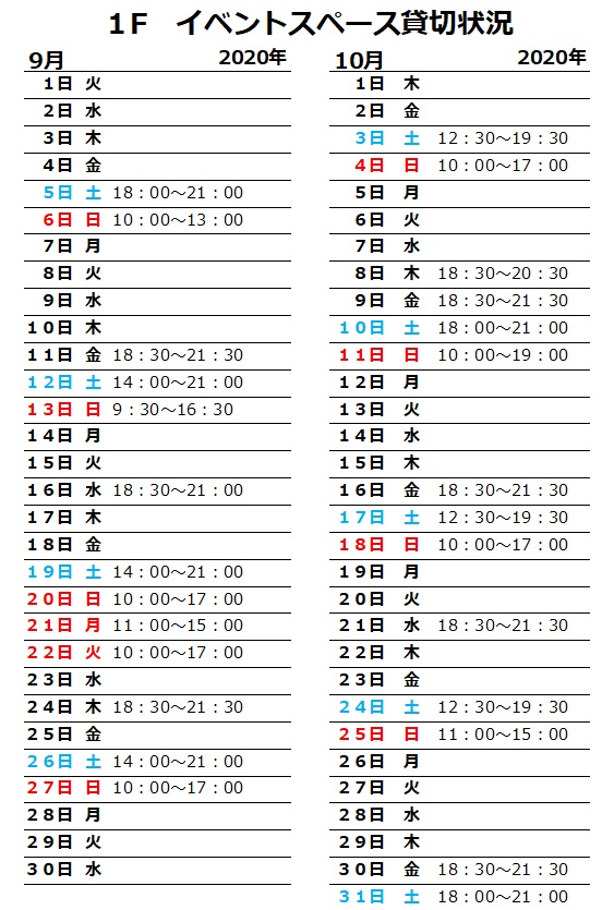 【1F貸切状況のお知らせ】 投稿日: 2020年9月20日 投稿者: link-staff みなさまお世話になっております。 2020年9月、10月の 1Fコワーキングスペース貸切状況お知らせです。 (9月20日現在) 前回投稿より、変更がございましたのでお知らせいたします。 下記の時間帯は1Fのコワーキングスペースのご利用ができません。 ご不便をおかけいたしますが、どうかご了承くださいますよう お願い申し上げます。 また空室状況により、臨時のコワーキングスペースや 個室を ご用意いたします。 当日、受付までお問い合わせください。 どうぞ宜しくお願いいたします。