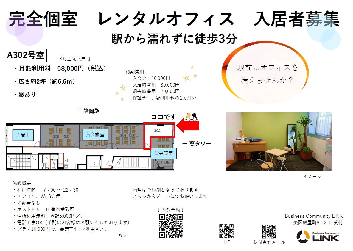 完全個室のレンタルオフィス 窓あり 投稿日: 2021年2月24日2021年2月24日 投稿者: link-staff 一番人気の窓がある完全個室のオフィスに空きがでました。 1~2名くらいで使用するのにちょうどいいお部屋です。 内覧予約・お問い合わせ ↓ info@orangehouse-link.com